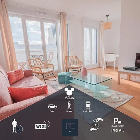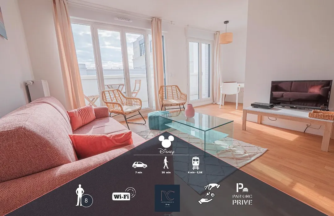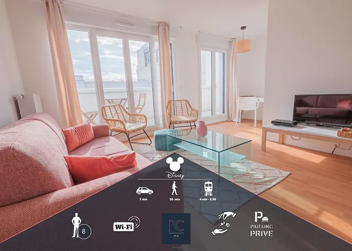 Kun 1 km fra Aquarium Sea Life Paris Val D'Europe, tilbyder *Disneyland-Paris* 8 Pers, Wifi, 2 Parkings ferielejlighed værelser med udsigt over byen. Faciliteter til egen forplejning indeholder et fuldt udstyret køkken med en mikrobølgeovn, en el-kedel og kaffemaskiner/tekedler.